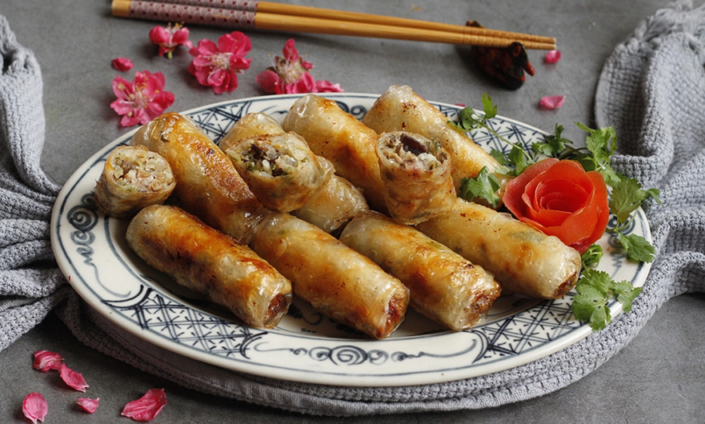 Spring rolls or fried spring rolls are a traditional and popular dish of the Vietnamese people, appearing on important occasions such as Tet. The main ingredients of the dish are minced pork and shrimp and wrapped in thin rice paper. Other ingredients in the spring roll filling include wood ear mushrooms, shiitake mushrooms, green onions, eggs, thinly sliced cabbage or mushrooms, vermicelli, and bean sprouts. After being fried, spring rolls are golden brown, crispy and salty, and eaten with sweet and sour dipping sauce.