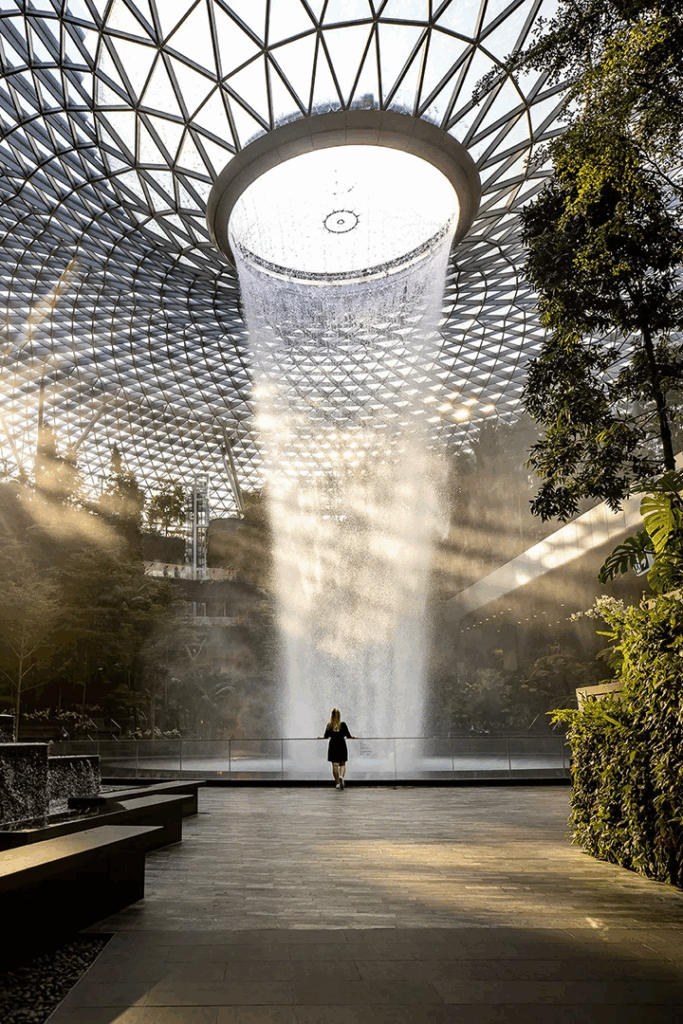 Sân bay Changi là nơi tuyệt đẹp để check in với sự kết hợp của thiên nhiên với kiến trúc hiện đại. Rain Vortex, thác nước trong nhà cao nhất thế giới, là điểm thu hút đông đảo du khách tại sân bay Changi. Thác nước bảy tầng đổ xuống qua thung lũng nhân tạo Shiseido tươi tốt còn mê hoặc hơn vào ban đêm, tạo nên những bức ảnh ấn tượng. Có rất nhiều cầu vượt và lối đi xung quanh thác nước cho phép bạn check in từ nhiều góc độ khác nhau. Sự hòa hợp độc đáo giữa cây cối, vũ điệu dòng nước và kiến trúc hiện đại của sân bay Changi khiến nơi đây trở thành điểm đến không thể bỏ qua đối với các du khách muốn có những bức ảnh đẹp.