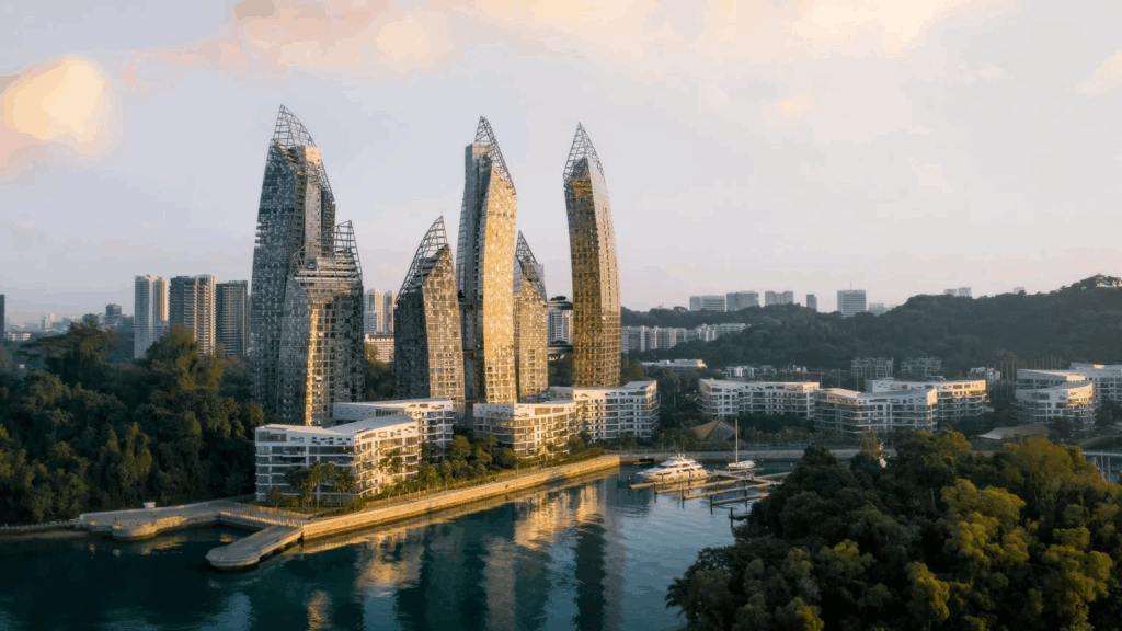 Một trong những địa điểm chụp ảnh đẹp nhất trong thành phố Singapore là Reflections at Keppel Bay, đây là địa điểm check in tuyệt đẹp kết hợp hoàn hảo giữa kiến trúc hiện đại và quang cảnh bờ sông tuyệt đẹp. Các du khách có thể chụp được những bức ảnh động chân thực về các tòa nhà hòa lẫn hình ảnh phản chiếu của chúng. Khu vực bờ sông thoáng rộng cũng là một địa điểm chụp ảnh thường được du khách yêu thích, với góc chụp ấn tượng của các tòa nhà chọc trời hay các hàng cây xanh tươi tốt bao quanh. Nơi đây trở thành địa điểm check in tuyệt vời vào lúc bình minh hoặc hoàng hôn khi sắc vàng của bầu trời tương phản tuyệt đẹp với những tòa tháp hiện đại, bóng bẩy.