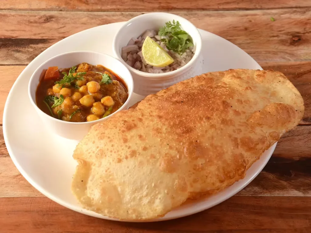 Chole Bhature, Punjab: Đây là sự hòa quyện của đậu gà cay và bánh mì chiên giòn. Bánh mì được lên men nên to và xốp, rất thích hợp để múc súp. Bạn thường sẽ có một ít rau ngâm hoặc hành sống để ăn kèm để giảm bớt độ béo ngậy.