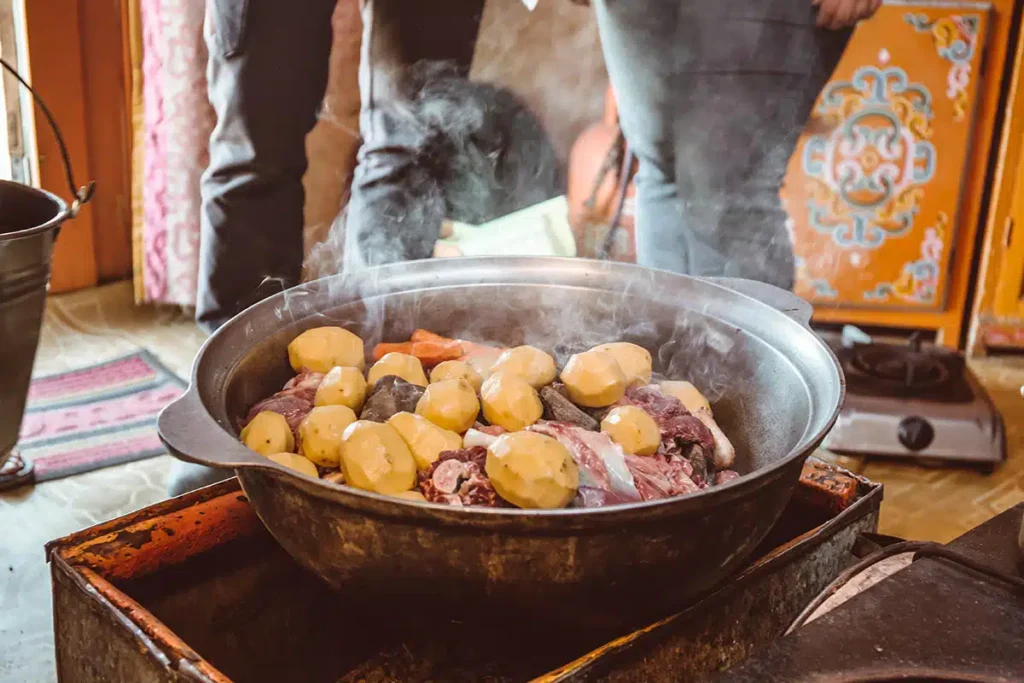 Khorkhog: Đây là món ăn truyền thống được chế biến bằng cách nấu thịt, khoai tây và hành tây trong nồi đá nóng.