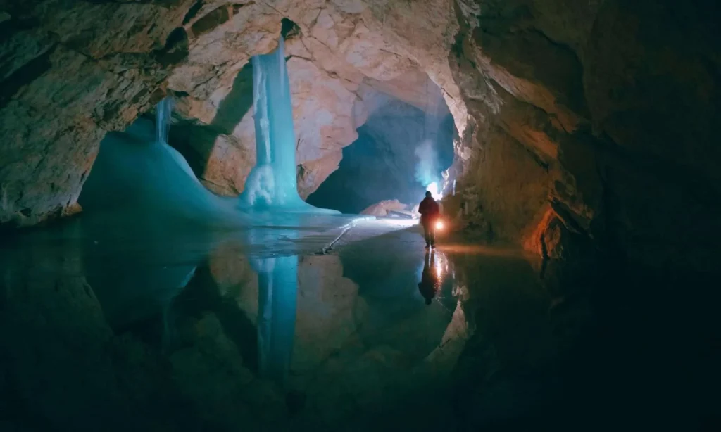 Hang băng Eisriesenwelt, nằm ở Werfen, Áo, là một kỳ quan thiên nhiên và là hệ thống hang động băng lớn nhất thế giới. Trải dài hơn 42 km, chỉ có km đầu tiên mở cửa cho khách du lịch, trưng bày những khối băng ngoạn mục được tạo ra bởi tuyết tan và đóng băng lại bên trong hang động. Được phát hiện vào năm 1879, những hang động này là minh chứng cho nghệ thuật của thiên nhiên, với phần bên trong băng được chiếu sáng bằng đèn đuốc, mang đến trải nghiệm siêu thực cho du khách.
